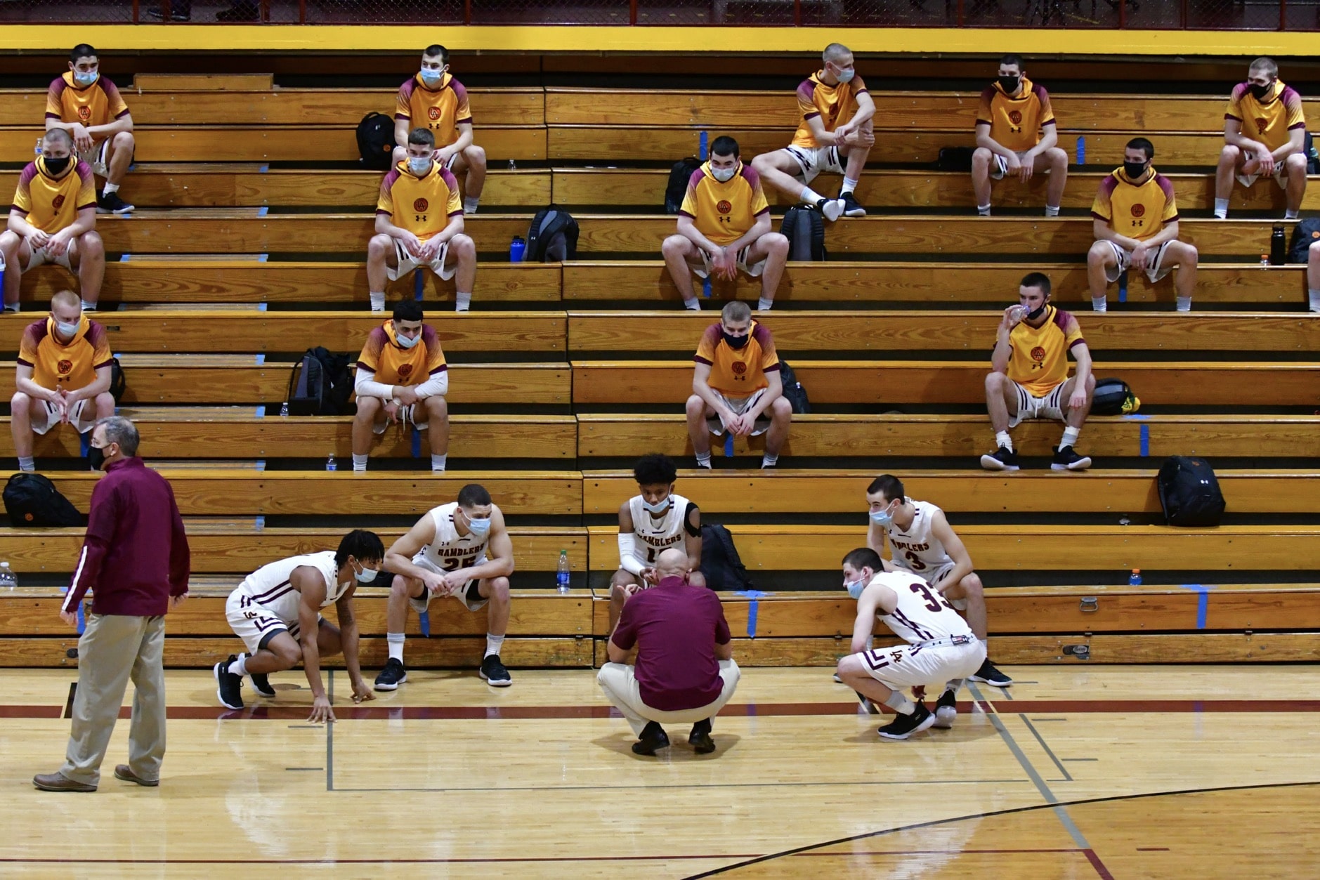 Socially distanced Loyola Academy players listen in during a timeout Friday, Feb. 5, during their season-opening game against Maine South.