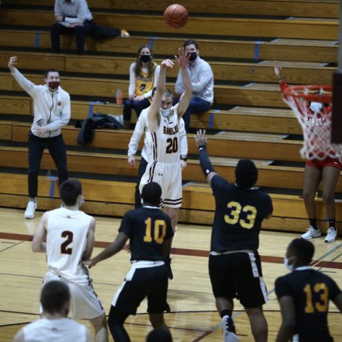 Loyola's Jake Moser hits an early three-pointer Wednesday. Feb. 24, during the Ramblers' 60-35 win over Providence-St. Mel on senior night.