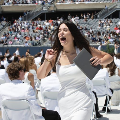 New Trier High School student Meg Armour is thrilled after she gets her diploma on Sunday, May 30, at Soldier Field, in Chicago.