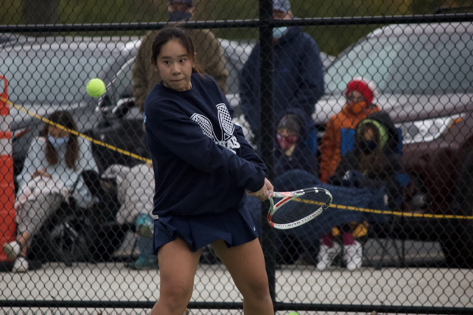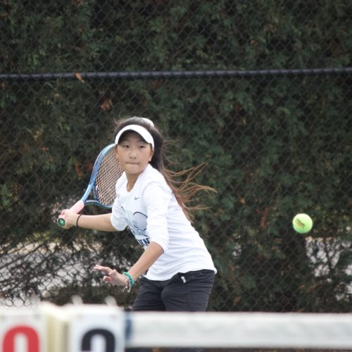 Trevs freshman Tess Trieu returns a shot on her backhand Saturday, Oct. 17, during her sectional doubles match.